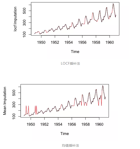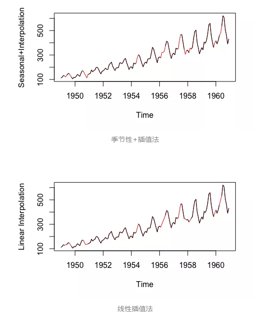 注:以上数据来自imputeTS库的tsAirgap;插补数据被标红。
