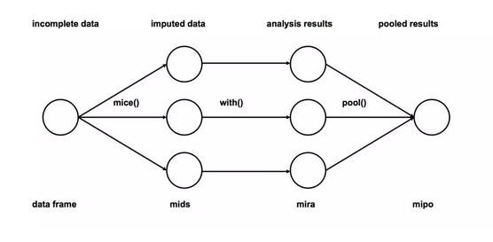 1、插补:将不完整数据集缺失的观测行估算填充m次(图中m=3)。请注意,填充值是从某种分布中提取的。模拟随机抽取并不包含模型参数的不确定性。更好的方法是采用马尔科夫链蒙特卡洛模拟(MCMC,Markov Chain Monte Carlo Simulation)。这一步骤将生成m个完整的数据集。