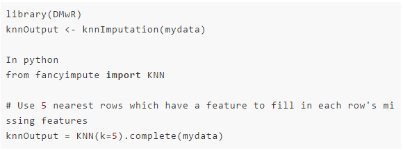 能够用于数据插补的机器学习方法有很多,比如XGBoost与Random Forest,但在这里我们讨论KNN方法,因为它被广泛应用。在本方法中,我们根据某种距离度量选择出k个“邻居”,他们的均值就被用于插补缺失数据。这个方法要求我们选择k的值(最近邻居的数量),以及距离度量。KNN既可以预测离散属性(k近邻中最常见的值)也可以预测连续属性(k近邻的均值)。