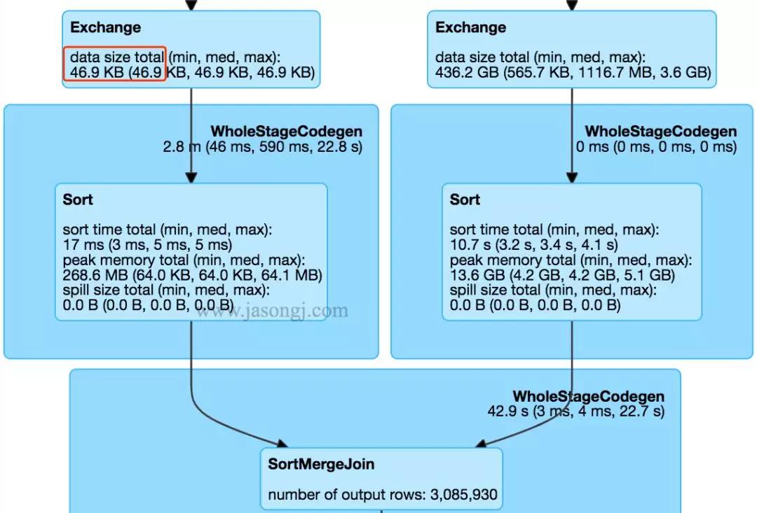 SortMergeJoin 需要在 Shuffle Read 时对来自 Stage 0 与 Stage 1 的数据进行 Merge Sort,并且可能需要 Spill 到磁盘,开销较大