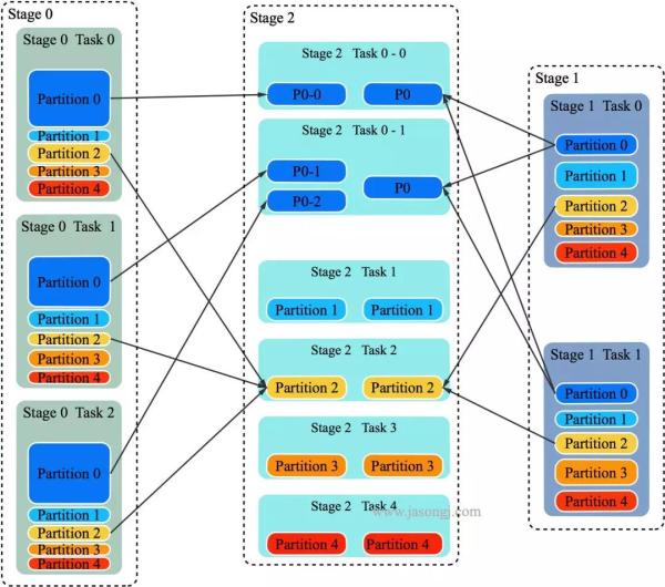 Task 0-0 与 Task 0-1 都从 Stage 1 的两个 Task 中所有属于 Partition 0 的数据