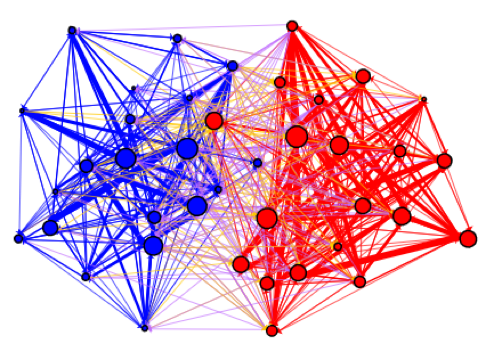 同质相吸原则经常用于社交网络研究。Adamic和Glance在2004年大选期间对政治博客进行了一项引人入胜的研究。 他们用图表的方式,显示了不同的博客如何相互引用;蓝色节点代表自由博客,红色节点是保守的博客。 也许不出所料,他们发现博客倾向于引用同样政治倾向的其他博客。