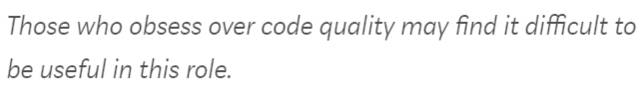 我曾见过一名分析师被工程文化浓厚的团队欺负,因为团队成员显然没有意识到所谓“优秀代码”很难用描述性分析进行解释。正是如此,这里的“优秀”指的是“高效和谦虚”。如果一个高效但粗心的程序员无法融入团队,他们自然会离开,而这也证明了自己对业务反应敏捷。