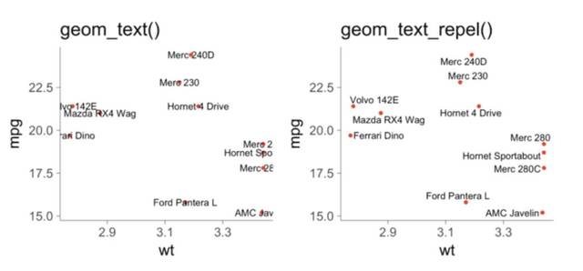 ggrepel只有一个非常有用的目的:让ggplot2用户更好地控制图表中文本标签的位置。正如每个R编程人员所知道的那样,ggplot2处理文本标签的默认方式有时不太理想。(看看上面左边的图表)