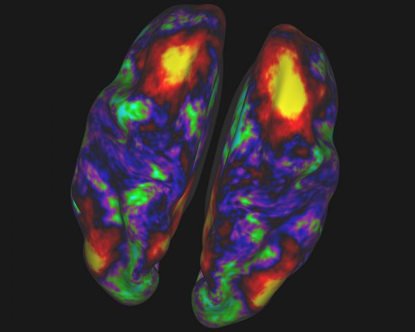 20名健康人类受试者处于休息状态下接受核磁共振扫描,得到的大脑皮层不同区域间新陈代谢活动的关联关系,并用不同的颜色表现出来。黄色和红色区域在功能上与右半脑顶叶中的“种子”位置(右上角黄斑)相关。绿色和蓝色区域则与之关联较弱或者根本没有关联。