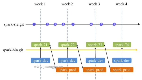 每周一(如果是 weekly release)从 spark-src.git/dev 打包出一个 release 放进 spark-bin.git/dev 的 spark-${ build # } 文件夹内(如图中第 2 周上方的的 spark-2 )。它包含了之前所有的提交(commit 1、2、3、4)