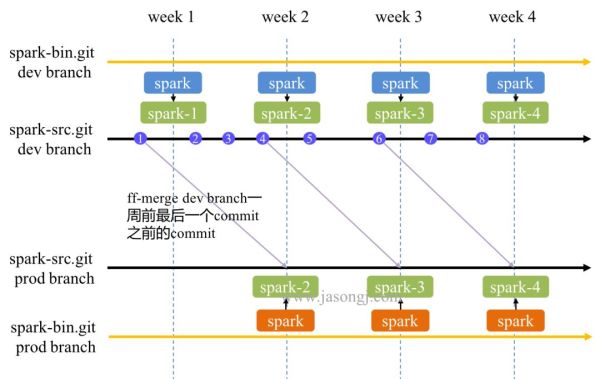 spark-src.git/prod 通过 fast-forward merge 将 spark-src.git/dev 一周前最后一个 commit 及之前的所有 commit 都 merge 过来(如图中第 2 周需将 commit 1 merge 过来)