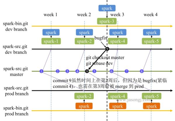 如下图中,第 2 周与第 3 周之间在 Staging 环境中发现 dev 版本的 bug,在 spark-src.git/dev(包含 commit 1、2、3、4) 上提交一个 commit(如图中黑色的 commit 9),且 commit message 中包含 bugfix 字样