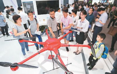市民在中国国际大数据产业博览会现场参观大型无人机。