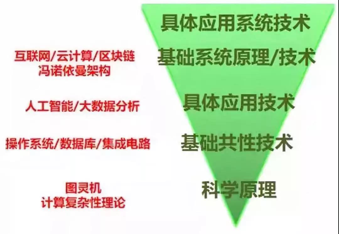 下面,我们来看一下信息技术产业中的不同要素,在从科学到应用的这个链条上,各自处于什么样的位置。为了不陷入不必要的细节而又能揭示本质,我们将这个链条分为五个环节:科学原理,基础共性技术,具体应用技术,基础系统原理/技术及具体应用系统,见图1。