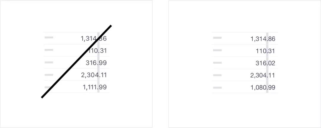 表格间距赋予所有的数字相同的宽度,使它们排列时能彼此对齐,使比较更容易。大多数流行字体都内置了表格。不确定字体是否正确?就看小数点(或任何数字)是否对齐就行。