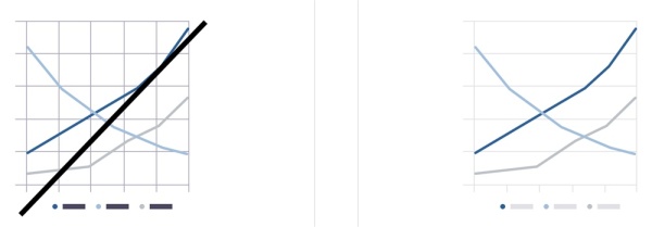 把不重要的东西减到最少或者去掉。这包括减弱或移除图形线,改变轴线 图形线的颜色,以及用浅灰色描绘电子表格。使得「数据比率」可以达到一个很高的水平,听众会更容易明白其中的数据情况。
