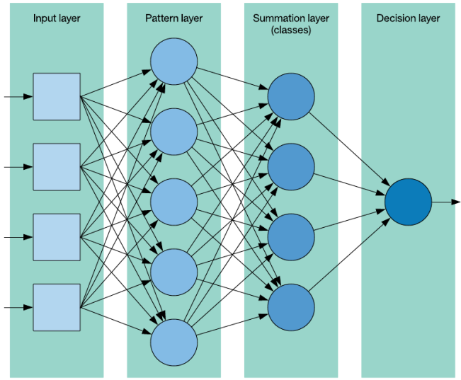 PNN 是一种监督学习方法,依赖于一个包含标签(用于标识每个观察值的类)的训练集。PNN 由 4 层组成,如下所示。
