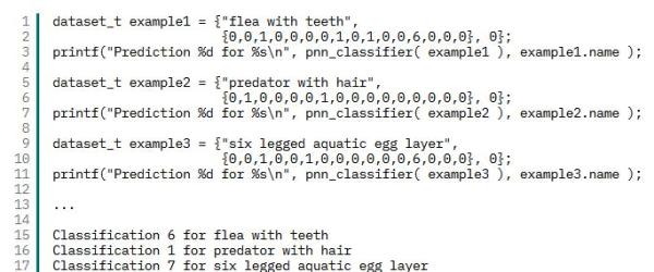 清单 3 给出了示例特征矢量的样本代码,以及用于演示使用 PNN 分类器的类预测结果的输出。此输出表明,一种有牙齿的跳蚤仍是昆虫;一种有毛发的掠食动物是哺乳动物;一种水生的、产卵的、有 6 条腿的动物是无脊椎动物。