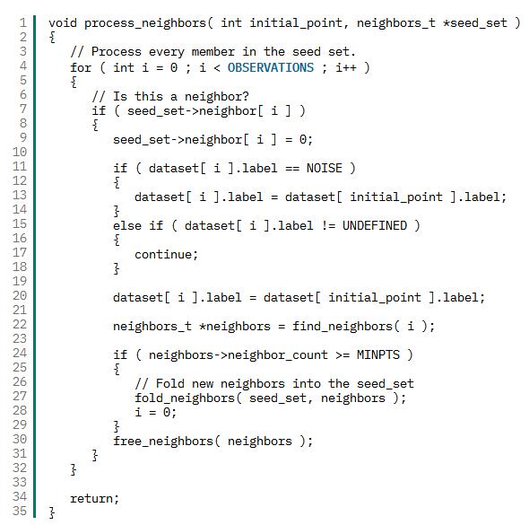 可以在 GitHub 上找到这个 DBSCAN 实现。现在我们探讨一下实现该算法的核心的两个关键函数。剩余函数处理距离计算和邻近点内存管理。