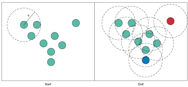让我们在图 2 的上下文中看看此流程。首先在左图中(名为 Start),我挑选了一个点并检查它的邻近点。如果 MINPTS == 2,我的点满足此条件并被添加到集群中。我们添加了两个邻近(密度可达)点用于测试,并继续执行该流程。只要每个点在 epsilon 距离内至少有两个邻近点,它们就会被添加到集群中并称为核心点)。密度可达但本身不满足密度标准的点是非核心点(例如蓝色的点)。该算法在右侧结束(名为 End)。绿色的点(核心点)和蓝色的点(非核心点,但密度可达)都包含在集群中。右上角的红色点是异常值,被视为噪声。