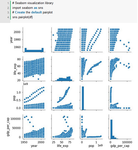 我仍旧大为吃惊,一行简单的代码就能够让我们得到整个图。散点图矩阵会构建两种基本图形:直方图和散点图。位于对角线位置的直方图让我们看到了每一个变量的分布,而对角线上下的散点图则展示了变量两两之间的关系。例如,第二行最左侧的散点图展示了 life_exp 和 year 之间的关系。