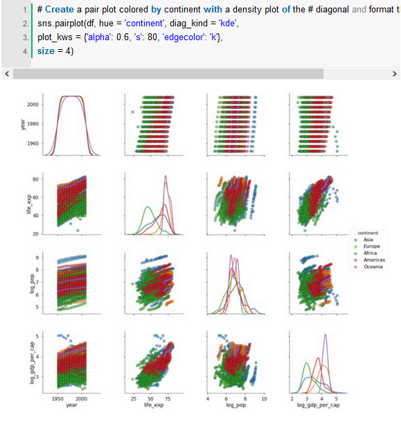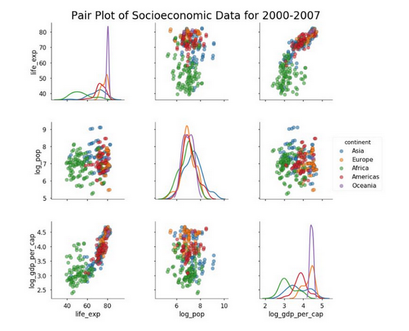 现在开始变得相当好看了!如果继续建模,我们可能会使用这些图中的信息指导我们的选择。例如,我们知道 log_gdp_per_cap 与 life_exp 是成正相关的,所以我们会创建一个线性模型来量化这种关系。本文主要集中在画图上面,如果希望更多地探索数据,我们可以使用 PairGrid 类定制散点图。