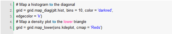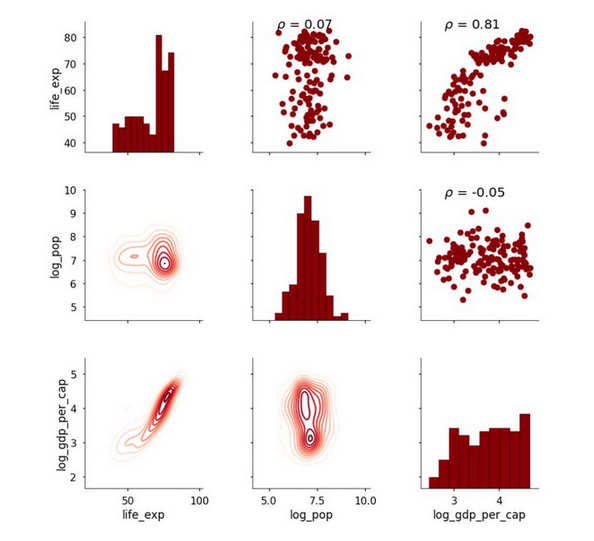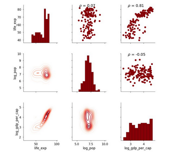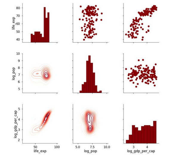 在这个例子中,我们在下三角中使用二维核密度估计(即密度图)。将上面的内容合在一起,这段代码就会给出下图: