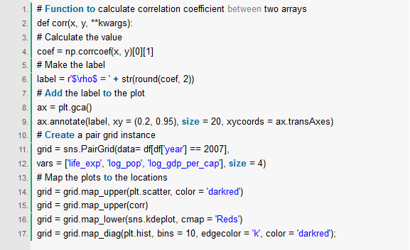 当我们想要创建自定义函数将不同的信息匹配到该图时,使用 PairGrid 类的实际好处就会显露出来。例如,我可能希望在散点图上增加两个变量的皮尔逊相关系数。为了做到这一点,我会写一个使用两个数组的函数,用它来计算统计数据,然后画在图上。下面的代码展示的就是如何做到这件事(来源:https://stackoverflow.com/questions/30942577/seaborn-correlation-coefficient-on-pairgrid)。