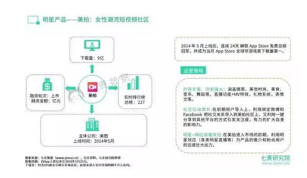 就目前的形式来看,快手、抖音能各顶半边天,但是两者作为独立短视频平台,主打社交,所涵盖的范围有限。在“抖音”还未火之前,“美拍”、“小咖秀”等先行者在短视频领域表现还是十分出彩。2014年5月上线的“美拍”,连续24天蝉联AppStore免费总榜冠军,并成为当月AppStore全球非游戏类下载量第一。
