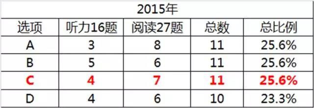 高考英语是高考9门里单项选择题最多,比例最高的科目,下面我们来看看2011年到2015年的单选题正确答案选项分布情况:
