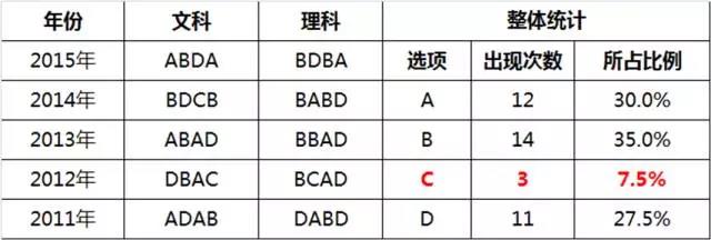 上图是2011年到2015年数学文理卷一共40题的答案选项和分布情况,可以看到在参考答案中,C是最少的,只出现了3次,明显少于其他选项。