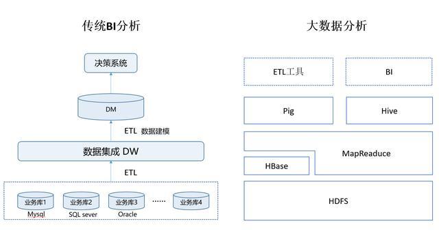 不管定义如何不同,大数据与传统BI是社会发展到不同阶段的产物,大数据对于传统BI,既有继承,也有发展,从"道"的角度讲,BI与大数据区别在于前者更倾向于决策,对事实描述更多是基于群体共性,帮助决策者掌握宏观统计趋势,适合经营运营指标支撑类问题,大数据则内涵更广,倾向于刻画个体,更多的在于个性化的决策。