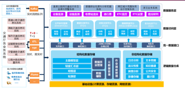 大数据平台把实时数据,包括高速公路上的收费、监控等实时数据上传,与传统业务数据进行整合,包括一些城市交通等外联单位的历史数据。将各类结构化、非结构化、半结构化的数据,包括监控图像、抓拍信息、收费日志和视频等信息,进行数据集成、数据转换处理,然后各自建模分析,形成专题数据,把专题数据应用到相应的应用系统中,提供支撑。