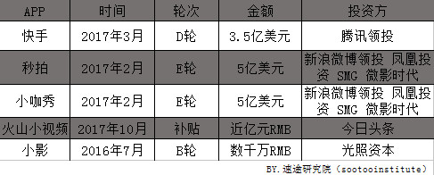 秒拍和小咖秀同属于一下科技,是最早进入短视频行业的开拓者,2017年2月完成了5亿美元的E轮巨额融资,新浪微博领投,凤凰投资、SMG和微影时代相继入局;背靠腾讯这棵大树,快手在短视频行业占据优势,用户数遥遥领先。在2017年3月完成D轮3.5亿美元的融资,这样的大手笔资金让快手商业价值无人能出其右,腾讯也成了百度之后第二个为快手投资的互联网巨头;火山小视频是由今日头条孵化出的短视频APP,今年十月份完成了近亿元的融资;小影则在2016年完成了数千万的B轮融资,光照资本是主要投资方。在资本的支持下,短视频将成为主流的文化形态,资本市场还会扩张。