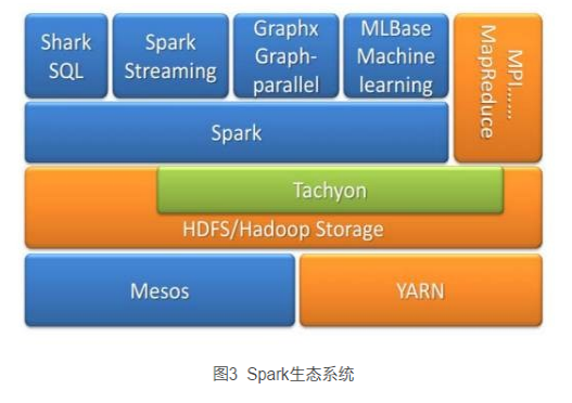 Hadoop社区正努力扩展现有的计算模式框架和平台,以便解决现有版本在计算性能、计算模式、系统构架和处理能力上的诸多不足,这正是Hadoop2.0 版本“ YARN”的努力目标。各种计算模式还可以与内存计算模式混合,实现高实时性的大数据查询和计算分析。混合计算模式之集大成者当属UC Berkeley AMP Lab 开发的Spark生态系统,如图3所示。Spark 是开源的类Hadoop MapReduce的通用的数据分析集群计算框架,用于构建大规模、低延时的数据分析应用,建立于HDFS之上。Spark提供强大的内存计算引擎,几乎涵盖了所有典型的大数据计算模式,包括迭代计算、批处理计算、内存计算、流式计算(Spark Streaming)、数据查询分析计算(Shark)以及图计算(GraphX)。Spark 使用Scala 作为应用框架,采用基于内存的分布式数据集,优化了迭代式的工作负载以及交互式查询。与Hadoop 不同的是,Spark 和Scala 紧密集成,Scala 像管理本地collective 对象那样管理分布式数据集。Spark支持分布式数据集上的迭代式任务,实际上可以在Hadoop文件系统上与Hadoop一起运行(通过YARN、Mesos等实现)。另外,基于性能、兼容性、数据类型的研究,还有Shark、Phoenix、Apache Accumulo、Apache Drill、Apache Giraph、Apache Hama、Apache Tez、Apache Ambari 等其他开源解决方案。预计未来相当长一段时间内,主流的Hadoop平台改进后将与各种新的计算模式和系统共存,并相互融合,形成新一代的大数据处理系统和平台。