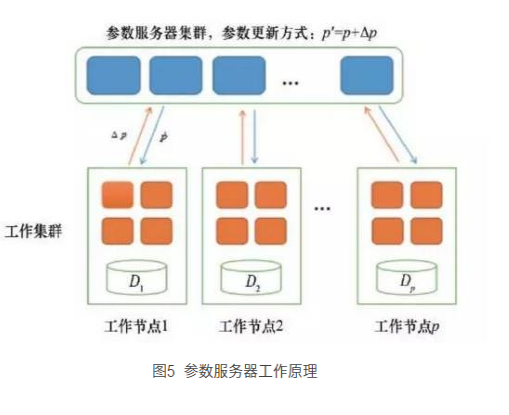 近年来,随着待分析数据规模的迅速扩张,分析模型参数也快速增长,对已有的大数据分析模式提出了挑战。例如在大规模话题模型LDA 中,人们期望训练得到百万个以上的话题,因而在训练过程中可能需要对上百亿甚至千亿的模型参数进行更新,其规模远远超出了单个节点的处理能力。为了解决上述问题,研究人员提出了参数服务器(Parameter Server)的概念,如图5所示。在参数服务器系统中,大规模的模型参数被集中存储在一个分布式的服务器集群中,大规模的训练数据则分布在不同的工作节点(worker)上,这样每个工作节点只需要保存它计算时所依赖的少部分参数即可,从而有效解决了超大规模大数据分析模型的训练问题。目前参数服务器的实现主要有卡内基梅隆大学的Petuum、PSLit等。