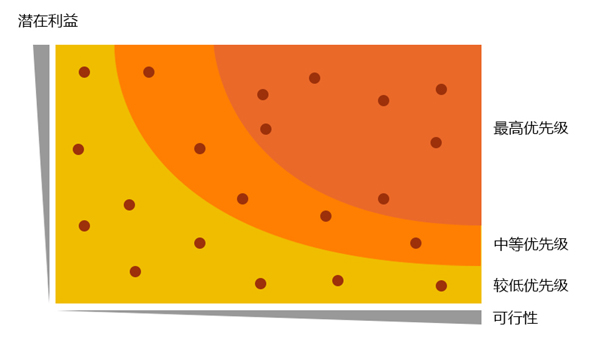 上图纵轴为潜在利益,越靠上说明方案带来的潜在利益越大;横轴则为可行性,越靠右说明方案越容易推行。