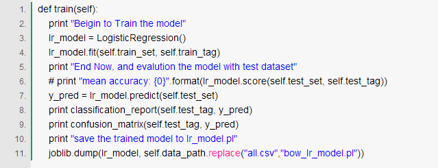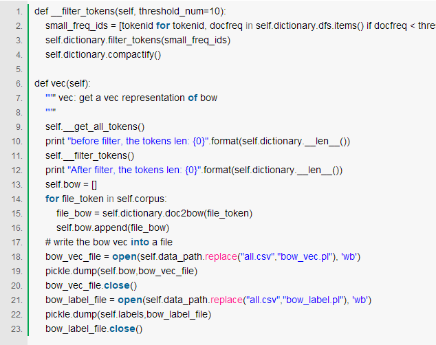 最终就得到每篇文章的bow的向量,由于这块的代码是在我的笔记本上运行的,直接跑占用内存太大,因为每一篇文章在token set中的表示是极其稀疏的,因此我们可以选择将其转为csr表示,然后进行模型训练,转为csr并保存中间结果代码如下:
