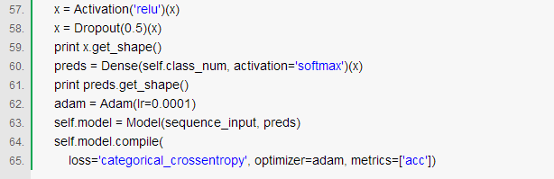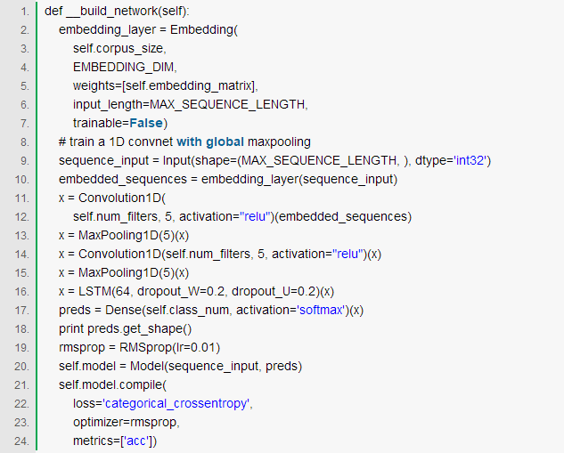 由于我这边的task是对文章进行分类,序列太长,直接接LSTM后直接爆内存,所以我在文章序列直接,接了两层Conv1D+MaxPool1D来提取维度较低的向量表示然后接入LSTM,网络结构代码如下: