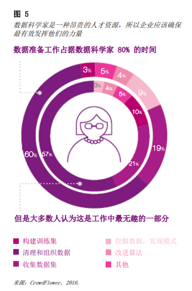 数据科学是数据驱动的,但我们发现太多的企业为实现目标所投入的时间和资源远远不够。最近一项针对数据科学专业人员的调研结果表明,数据收集、清理和组织工作消耗了他们近 80% 的时间;同时,超过四分之三的数据科学家表示这些任务最无趣乏味(见图 5)。