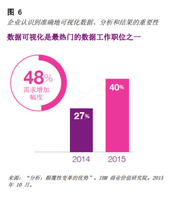 如果数据可视化效果、分析流程或预计的成果不理想,那么项目就可能会失败。人们从这样的失败中总结经验教训,看到了数据可视化的重要性,使其成为最热门的数据工作职位之一,2014 年仅有 27% 的企业表示有此需求,而 2015 年这一数字上升到了 40%(见图 6)。