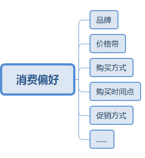 某公司的业务团队想要了解用户的消费偏好是怎么样的。当业务团队说我们要构建用户消费偏好画像的时候,往往是指各种场景下用户是如何选择做出选择的,所以需要具体把偏爱画像拆分成几个不同数据标签: