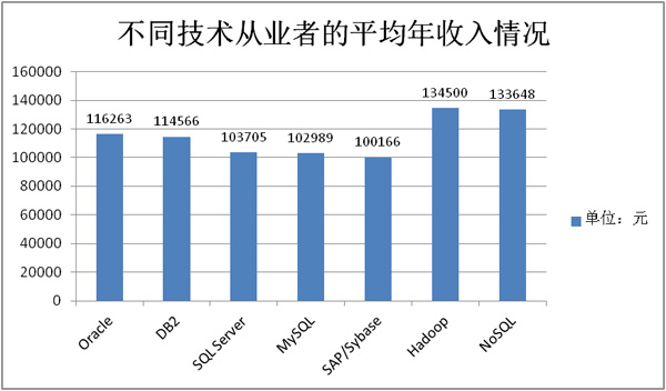 在我们上一次的数据库工程师薪酬调查报告中,Oracle DBA的平均收入是最高的,而这一情况在2013年出现了变化。伴随大数据时代的到来,包括Hadoop、NoSQL相关技术的从业人员收入大部分高于平均水平。根据本次调查显示,Hadoop从业者的平均年收入最高,达到134500元;排名第二的NoSQL DBA平均年收入为133648元;而此前收入排名首位的Oracle DBA已经降到第三位,平均年收入为116263元。