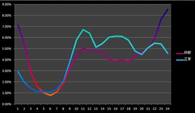 存在抑郁倾向的微博用户与普通用户发博时间有明显差异,这部分人群发博高峰在 23 点,其夜间活跃度比普通用户平均约高出 30%(图二)。该群体微博关键词为:死、抑郁症、生命、痛苦、自杀(见图一)。有 60% 为女性,40% 为男性,女性比例比男性略高,也与之前两位女性微博用户 “走饭” 、“sienna赛娜” 因抑郁症而自杀的报道相符。