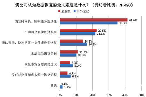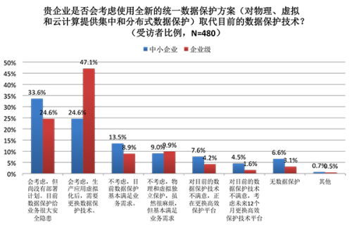 而从用户对数据保护满意度的调查来看(图2),73.4%%的受访者对现有的数据保护不满意。其中,47.1%的企业级受访者表示(图3),现有数据保护很难应对生产应用虚拟化,在生产应用虚拟化过程会考虑部署全新的统一数据保护。对这一结果,王丛(Kim Wang)认为,目前多数中国用户通过虚拟化主要用来提高服务器资源利用率,以实现服务器整合。物理环境和虚拟化环境的数据保护分离,大大加剧了数据保护的管理复杂度。同时,也加大了数据安全性,业务连续性风险。目前,较少用户通过虚拟化提高企业级数据整体保护效率。生产应用虚拟化过程驱动对提高对物理环境和虚拟化,以及云计算环境的统一,高效,自动化数据保护效率,以及提高根据应用/负载需求提供SLA数据保护服务的能力。
