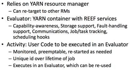 但Ramakrishnan指出,有些类型的任务,例如机器学习,对数据移动、任务监控有特殊要求,而且经常需要能够在之前的结果中回滚,并不适合YARN这样的框架。而运行在YARN纸上的REEF能够解决这些问题。