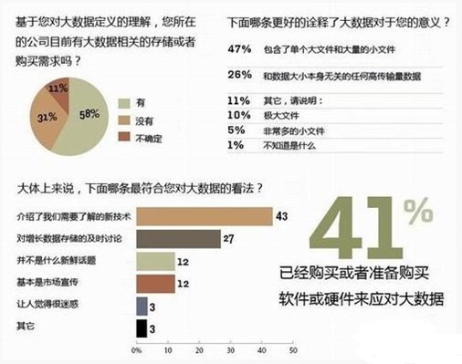 不管怎么定义,有58%的受访者说他们的公司已经有了应对大数据的设备,41%的人表示他们计划购买应对大数据的设备。排在榜首的设备包括光纤通道阵列(38%),可扩展NAS设备(36%),以及青睐软件产品受访者的管理应用(63%)。