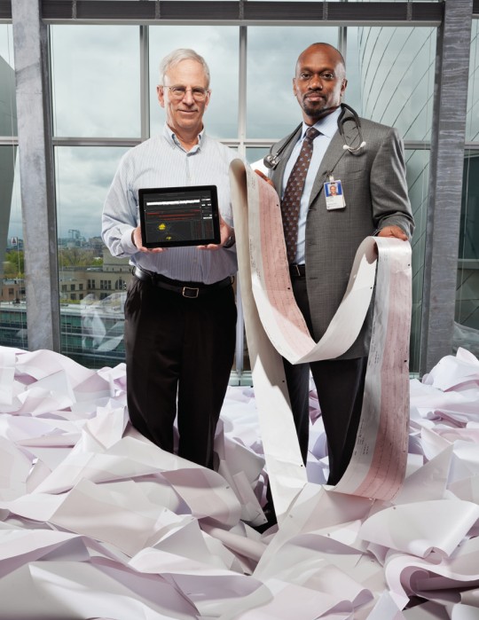 Jason Grow,2012/图片来源:大数据的人类面孔。( 由麻省理工学院的计算机科学家John Guttag、心脏病学家兼麻省理工学院的计算生物学家Collin Stultz(这两位在左图中有所显示)以及密歇根大学计算机科学家Zeeshan Syed这三位研究人员组成的团队创建了一个新型的计算机模型,对曾经被丢弃的心电图数据进行分析。通过使用数据挖掘技术和机器学习技术对大量的数据进行筛选,研究人员发现心电图中出现三种异常情况与不存在异常的情况相比,与该病人一年内第二次心脏病突发并死亡的风险会高两至三倍。Guttag、Stultz和Syed认为他们的新计算机模型将会大大改进如今的风险筛查技术--现在的改进技术漏掉了约70%可能会再次心脏病突发的病人。我们面临的挑战在于大部分病人可以通过改善饮食和增加锻炼得以康复。但是,一小部分人(约5%)需要积极的干预,如植入式除颤器。Guttag说:“我们工作的目的就是发现谁属于哪一类人群。”)