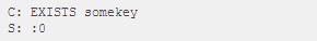 由于「somekey」不存在,所以服务器返回「:0」。 注意EXISTS命令只带有一个参数。多个参数以空格进行分隔。