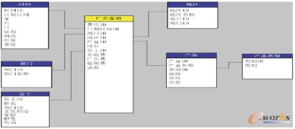 在图2中,事实表是广告促销表,其它的表为维度表,它们之间的连线表示关系。