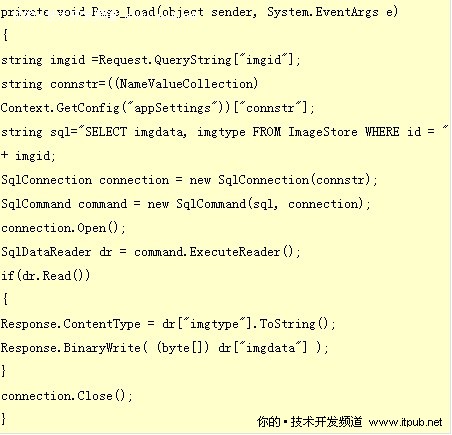 在上面的代码中我们使用了一个已经打开的数据库,通过datareader选择images。接着用Response.BinaryWrite代替Response.Write来显示image文件。