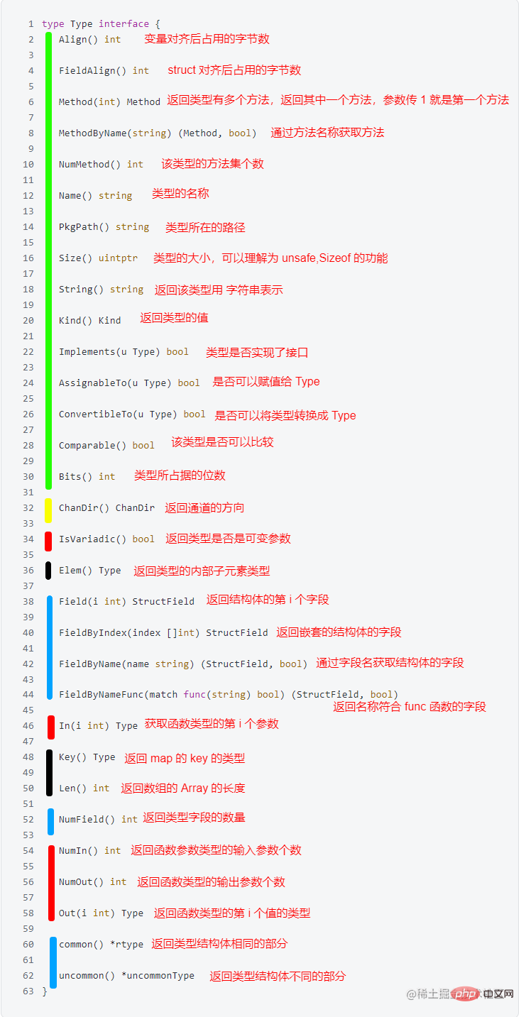 其中 reflect.Type 实际上是一个 interface ,他里面包含了各种接口需要进行实现,它里面提供了关于类型相关的信息