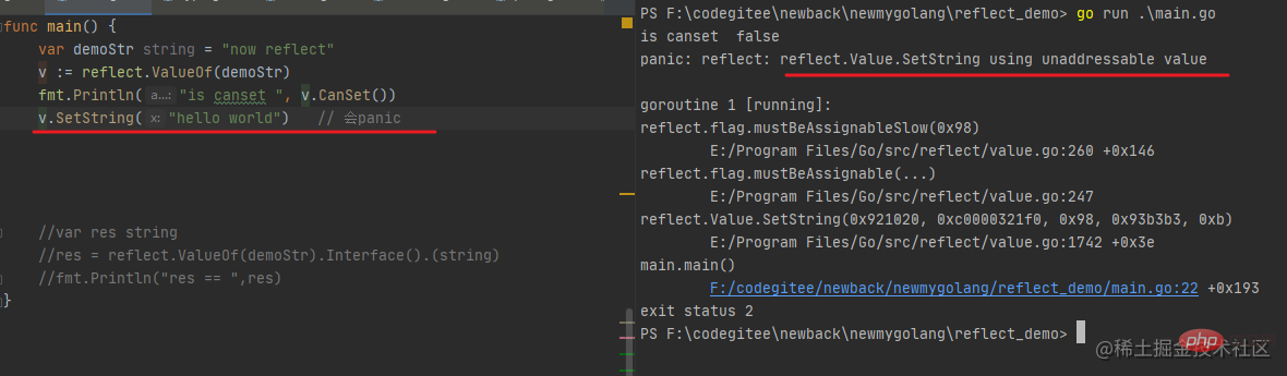 此处仔细看能够明白,反射的对象 v 自然是不可修改的,我们应该找到 reflect.Value 里面具体具体的数据指针,那么才是可以修改的,可以使用 reflect.Value 的 Elem 方法
