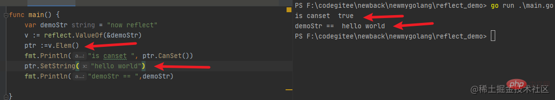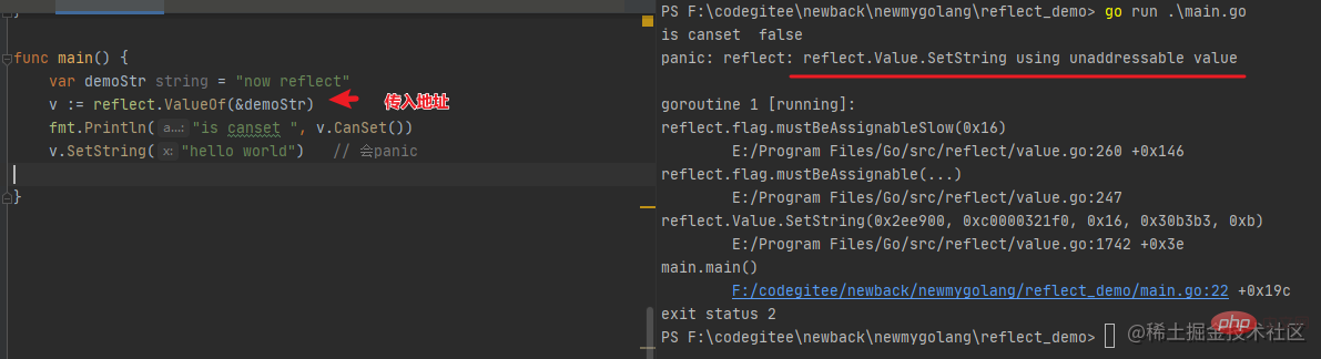 首先我们看上书的 demo 代码,传入 TypeOf 和 ValueOf 的变量实际上也是一个拷贝,那么如果期望在反射类型的对象中修改其值,那么就需要拿到具体变量的地址然后再进行修改,前提是这个变量是可写的